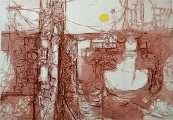 Original etching on Yellow paper. Plate size: 4 X 4½-inches. Print size: 5½ x 8½-inches. Has been attributed to Jack, but most likely created by his spouse Joan. Catalog #55 |