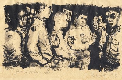 Office Party (Self Portrait) Original Lithograph, signed and numbered 12/15 Plate size: 10½ inches x 7-inches. Dated 1958