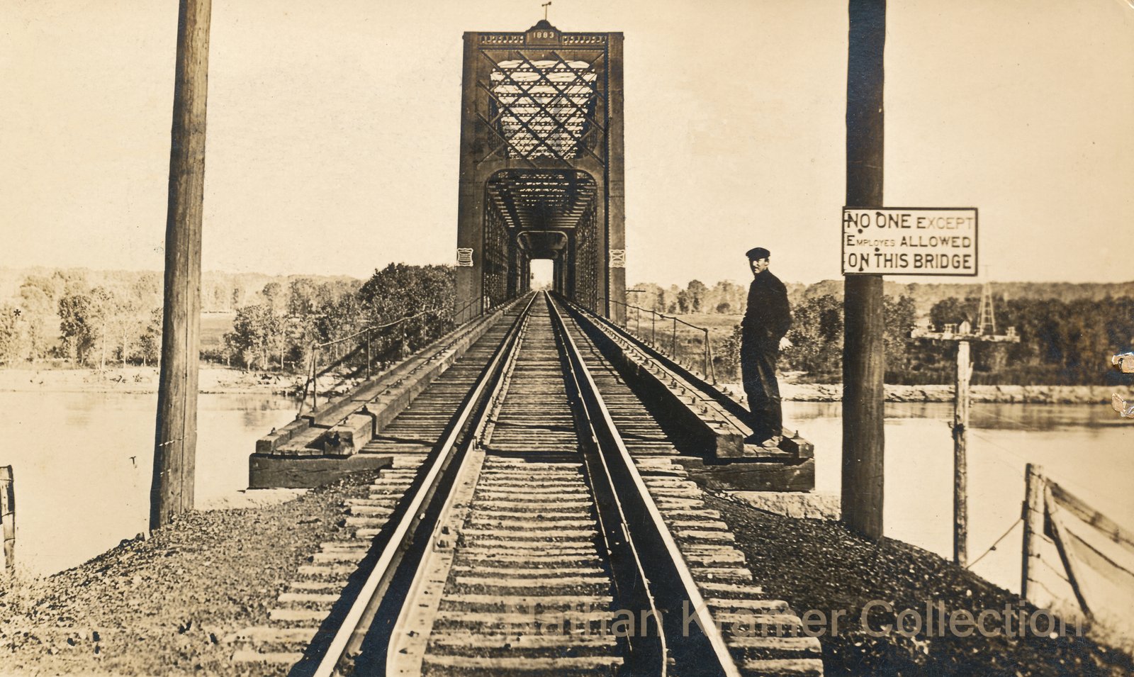 "Shortly after the original bridge across the Missouri River at Blair was completed in 1893, this photograph was taken from the Nebraska end of the bridge. The vulnerability of the low lying shore on the Iowa side to flooding is in evident; the riverbank in the distance behind the courageous employee was reinforced by facing the bank with large amount of heavy rock." - Fall 1997 issue of the Chicago & North Western Historical Society Magazine.