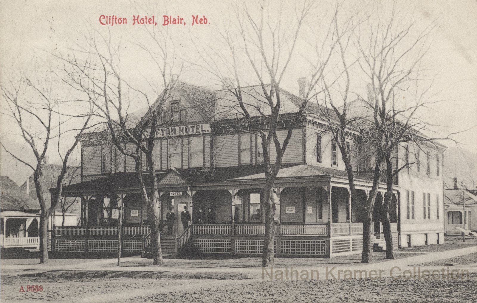Built in 1890 as on Keeley Cure Institution for Alcoholics by investors for Dr. Leslie E. Keeley's Double Chloride of Gold Remedies. The institute was moved to Omaha in 1900 and the building became a hotel. For many years, it operated as the Clifton Hotel. In its early days, it had 28 rooms, four of which had running water. It was located just across the street from the train depot at 1465 Front Street. Catalog #HAL-0004 |