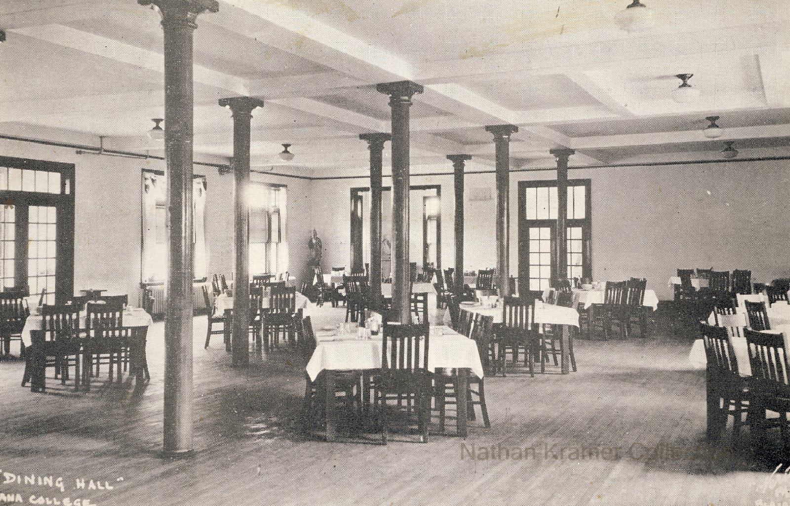 View of the dining hall on the first floor of the Women's Dormitory (now Argo Hall) -- looking into the southeast corner. The main east doors are on the far left side of the photograph.