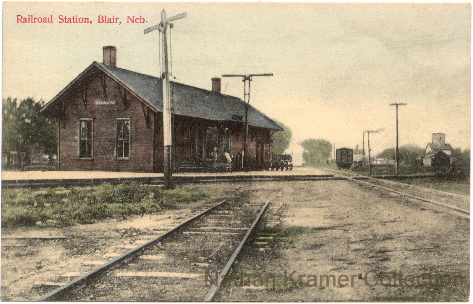 1880 Railroad Depot - Blair, Nebraska postcard dated 1908. View of north side, looking towards the west. Build as the passenger & freight depot, then moved west down the line to became a freight depot after the brick depot was built in 1910. The building was moved to a city park in the 2000s and restored as a picnic venue.