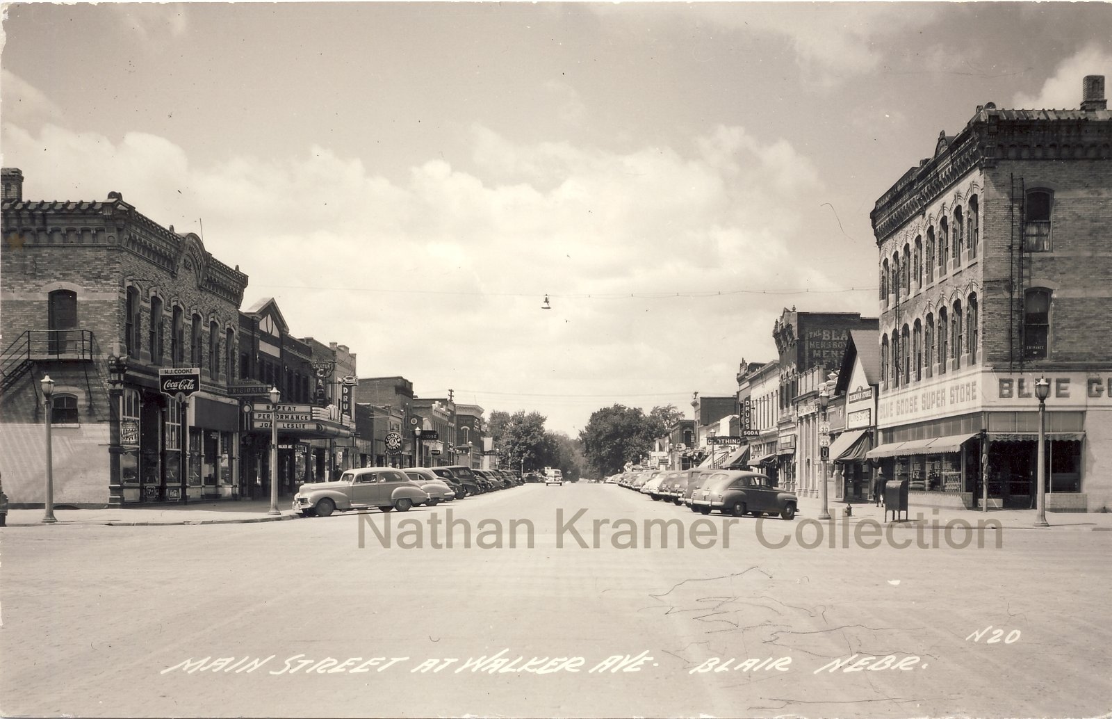 Mayle & Hungate Buildings is on the right side with the sign Blue Goose Supermarket on the right and the Washington County Bank and Home Theater on the left.