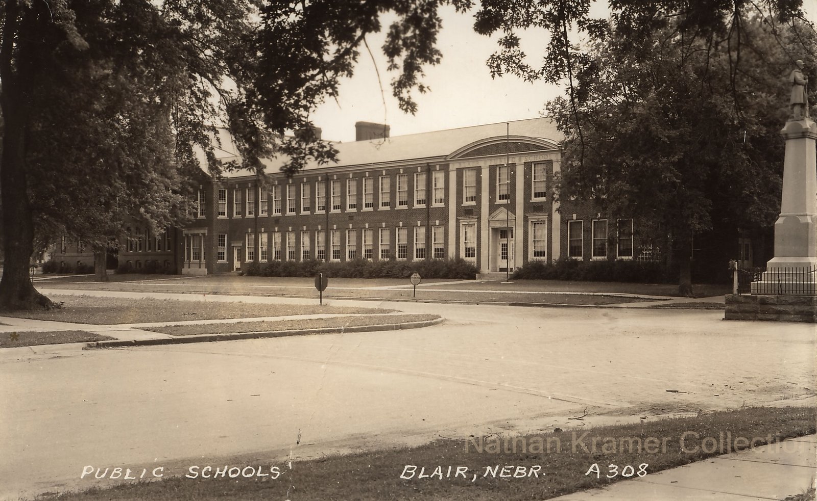 Blair High School, Blair, Nebraska Looking at the east side of 1929 addition to Central High School from the corner of Colfax Street and Walker Ave. from the Courthouse lawn. Note the Solder's Memorial Monument on the right that once stood in the middle of the intersection.